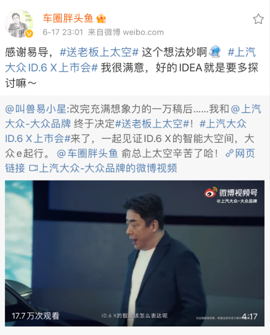 对于上汽大众来说,年轻群体如今已经成为消费主力军,是品牌非常重要的潜在用户。胖头鱼在这次预告片中也直言:“创意,就要让年轻人喜欢”。因此,找到年轻人所感兴趣的东西并借势展开品牌营销,是非常重要的。上汽大众通过与年轻人喜爱的两个IP宝可梦、《万万没想到》联动,成功打破了“次元壁”,同时借势航天热点,配合@车圈胖头鱼 的微博喊话,完成了一个“网红式”的上市玩法。